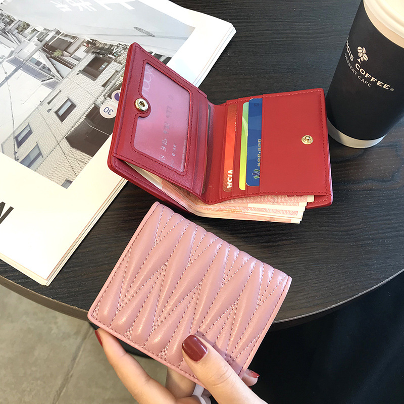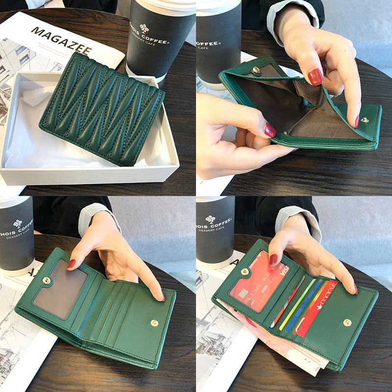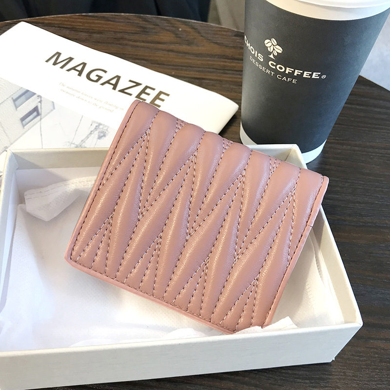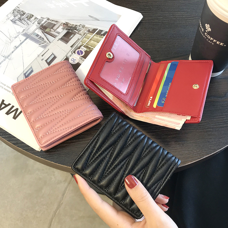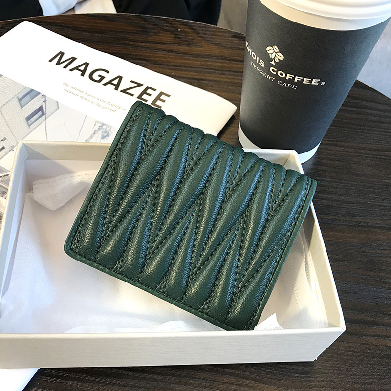【羊皮菱格折疊短夾】韓版時尚百搭黑色純色高檔羊皮褶皺小巧超薄對折零錢包皮夾短夾