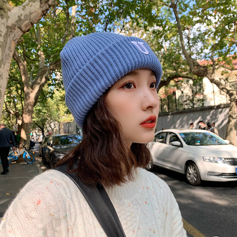 韓版百搭日系字母刺繡針織毛線帽子女秋冬季保暖護耳男女毛帽 (淺藍 均碼有彈力)