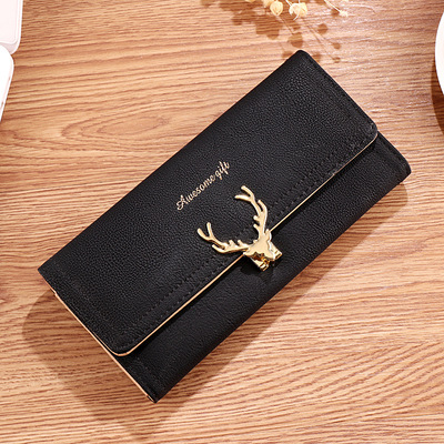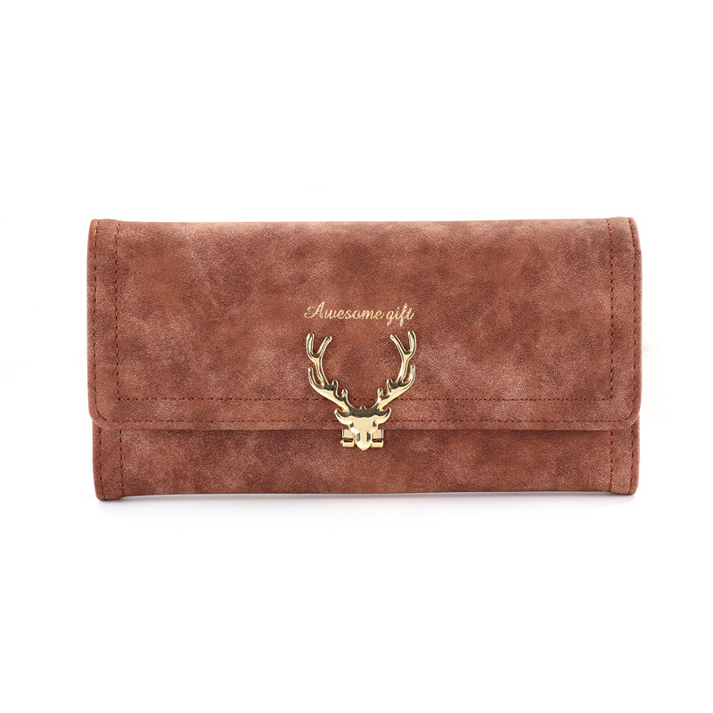 【磨砂皮三折長夾】【多卡位大容量】復古粉色純色磨砂皮紋麋鹿裝飾大容量三折錢包皮夾長夾