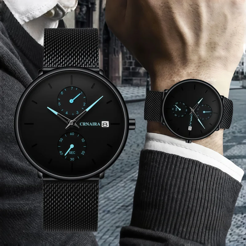 男錶・午夜渋谷 | 日本防水機芯 | 兩眼四針時計 | 米蘭尼斯網帶 | 日曆星期跑秒視窗 | 迷情藍針 | CRNAIRA日式多功能男石英手錶