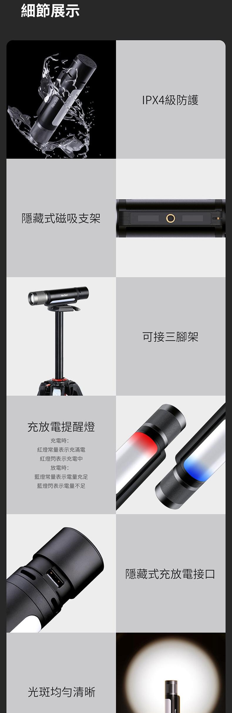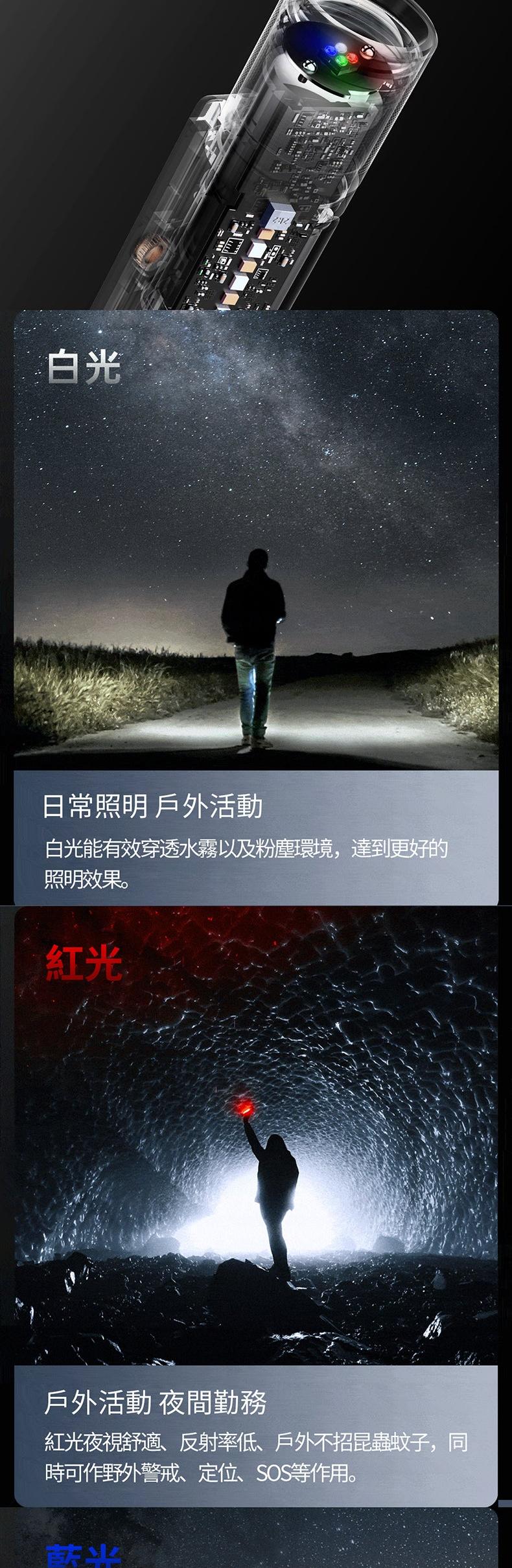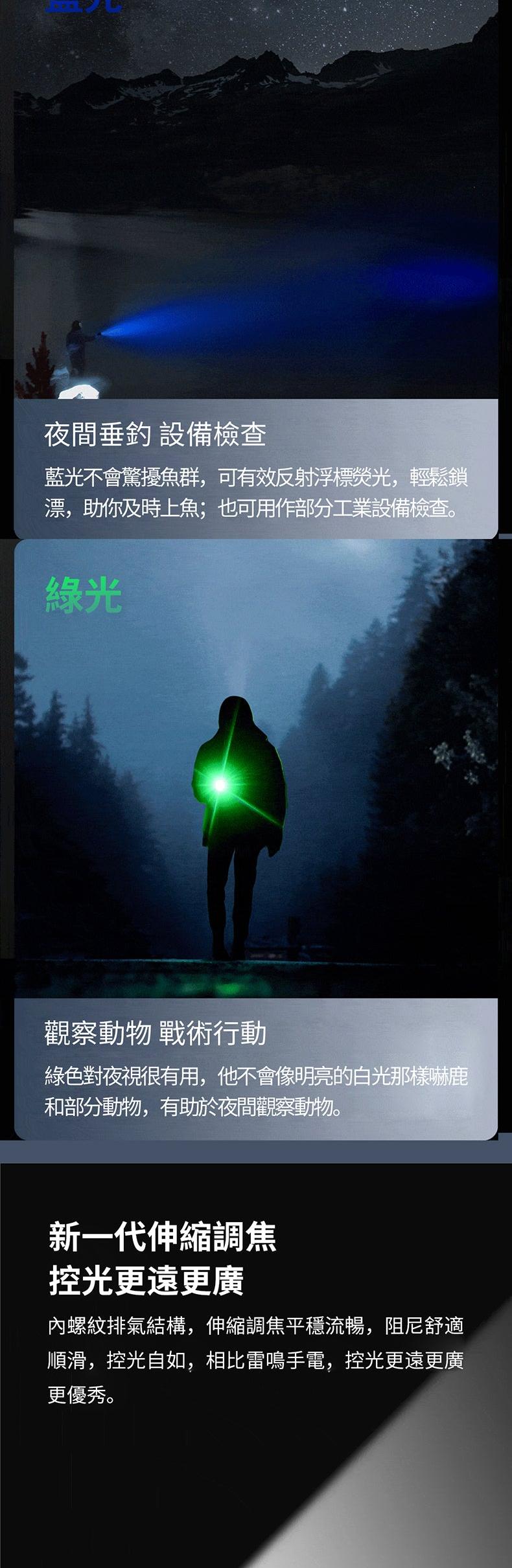 4色主燈,集合白/紅/綠/藍調焦手電與一體