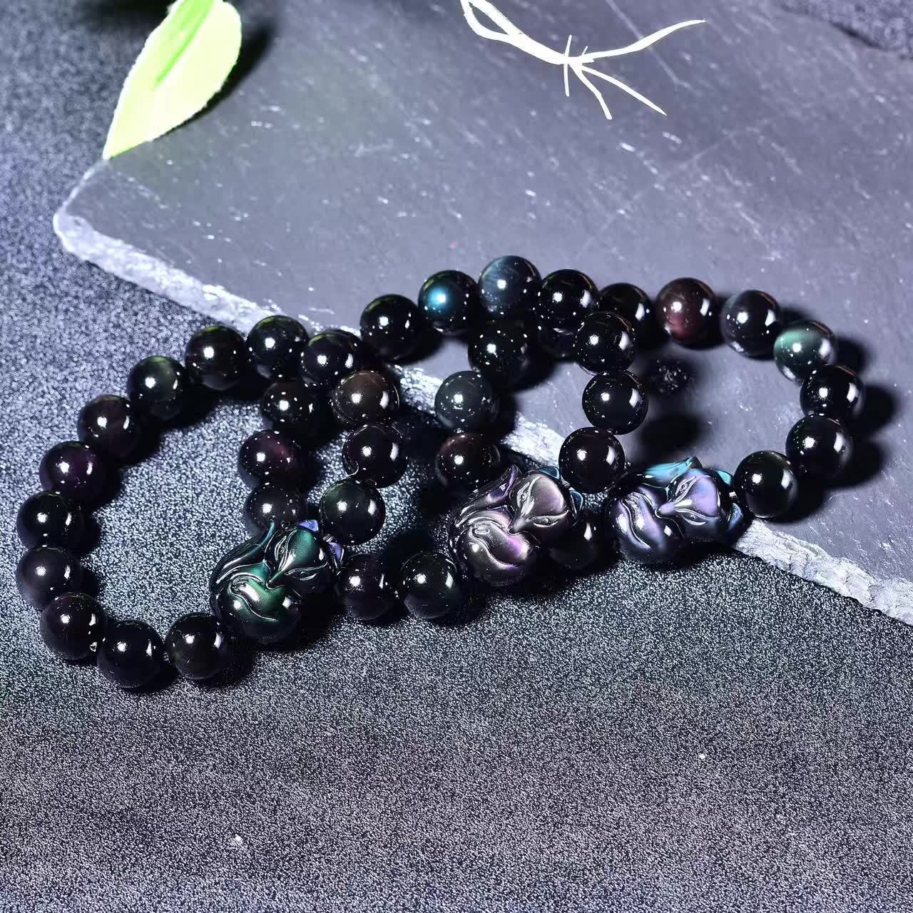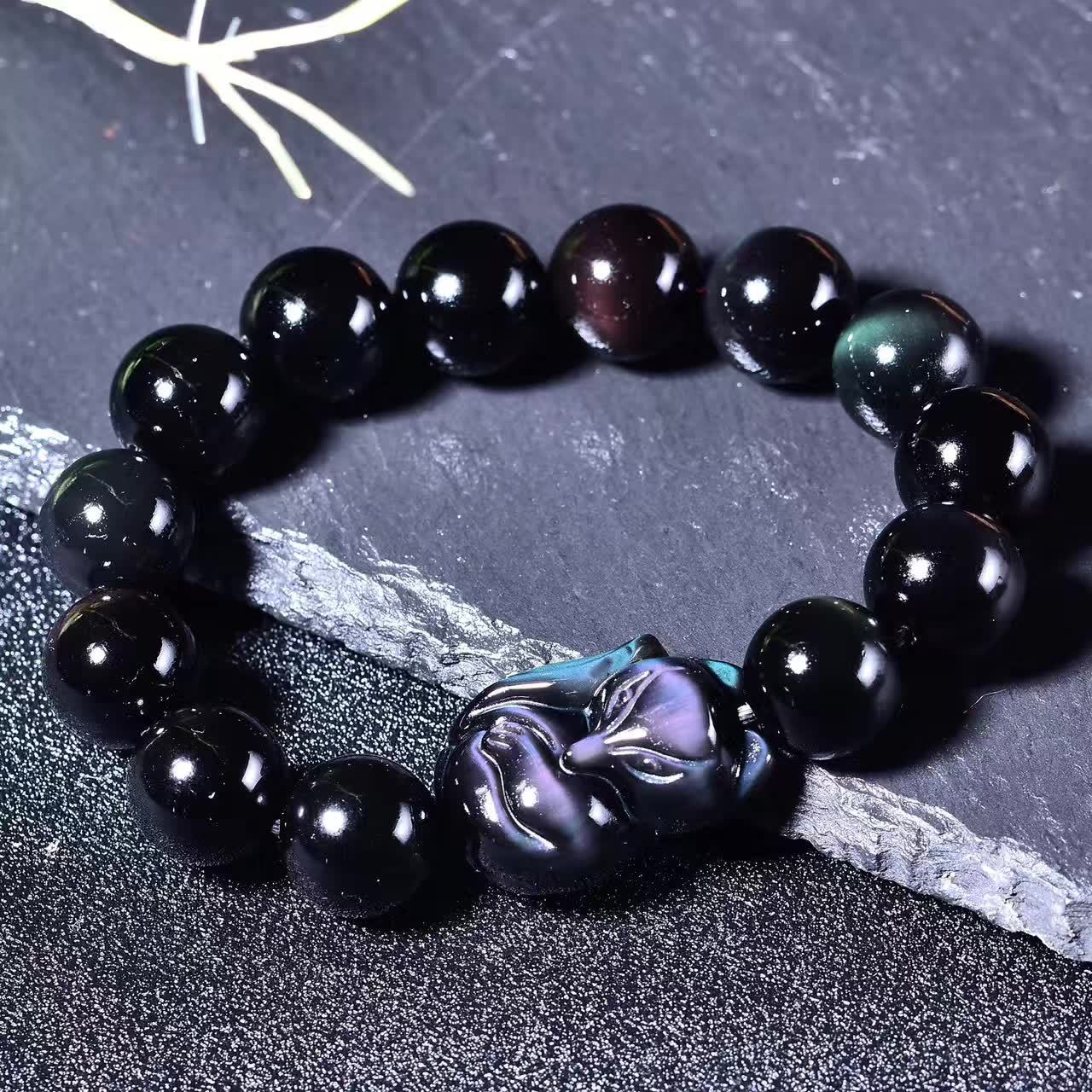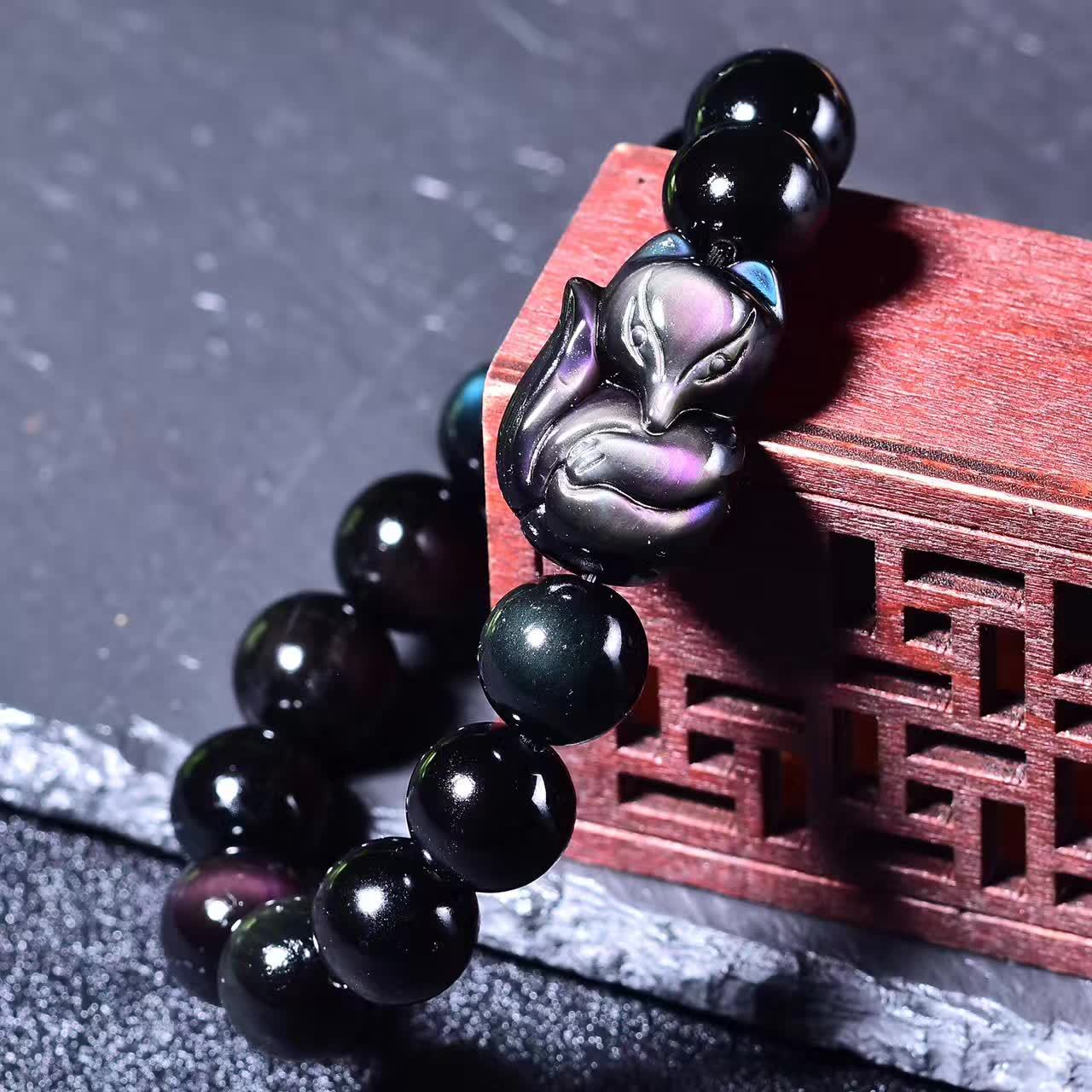 【天然雙彩虹眼黑曜石】【萌狐配飾】天然6A級雙彩虹眼黑曜石手串配小狐狸招財姻緣辟邪女水晶手鍊