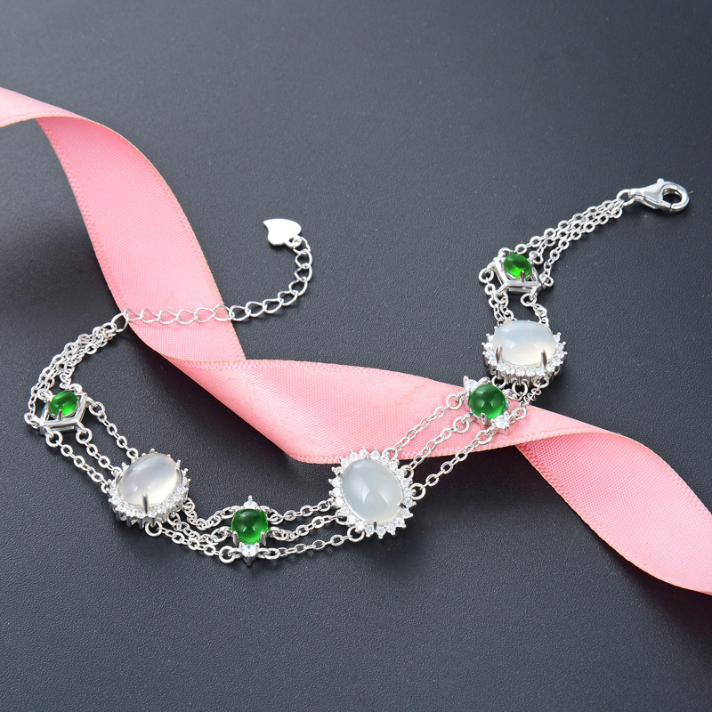 【素時錦年】【925純銀】【白貓眼綠水晶】設計師款高級氣質925純銀鑲嵌白貓眼石綠水晶鋯鉆女時尚百搭手鍊