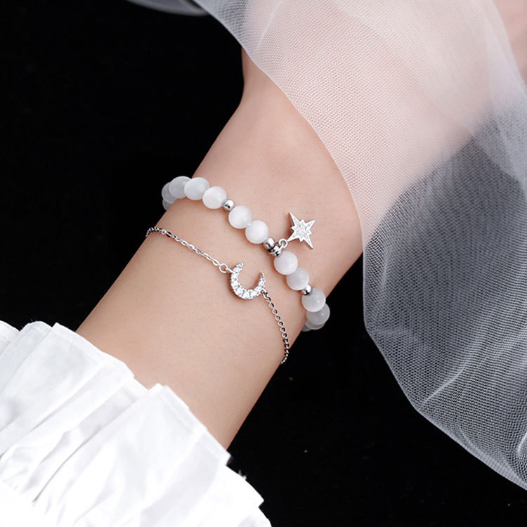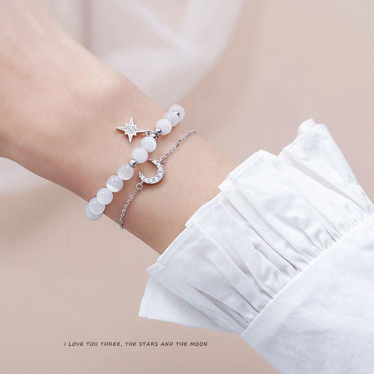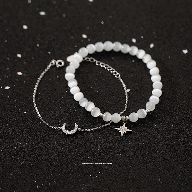 【星月神話】【天然貓眼石】【925純銀】設計師款夢幻氣質925銀貓眼石組合雙層手鍊女星月造型水晶手鍊