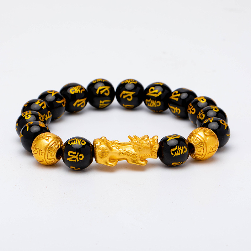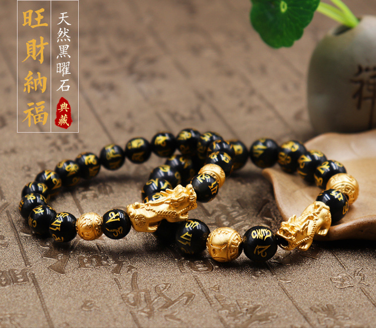 【貔貅手鍊二入組】【天然黑曜石】【沙金招財貔貅】【燙金六字真言】招財護身開運天然黑曜石手鍊配沙金貔貅轉運珠手串風水手鍊