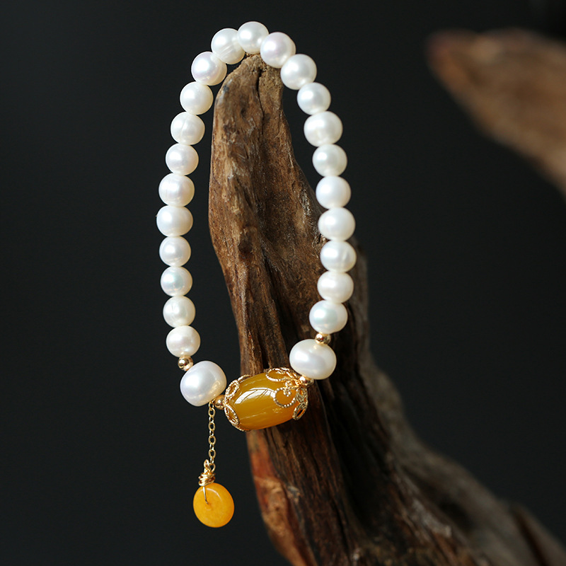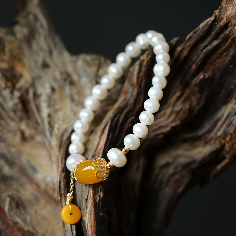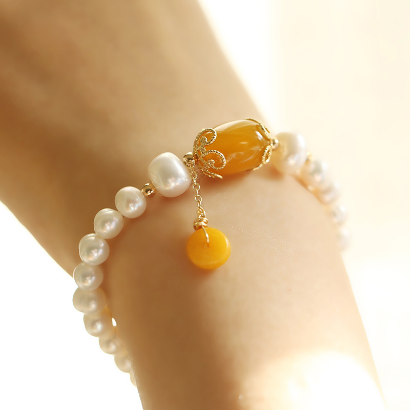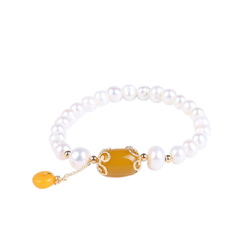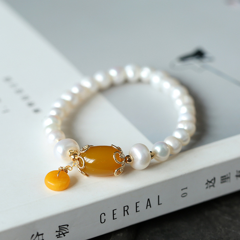 【天然淡水珍珠】【黃玉髓】高級氣質優雅天然淡水珍珠麵包珠手串配黃玉髓瑪瑙14K包金女手鍊