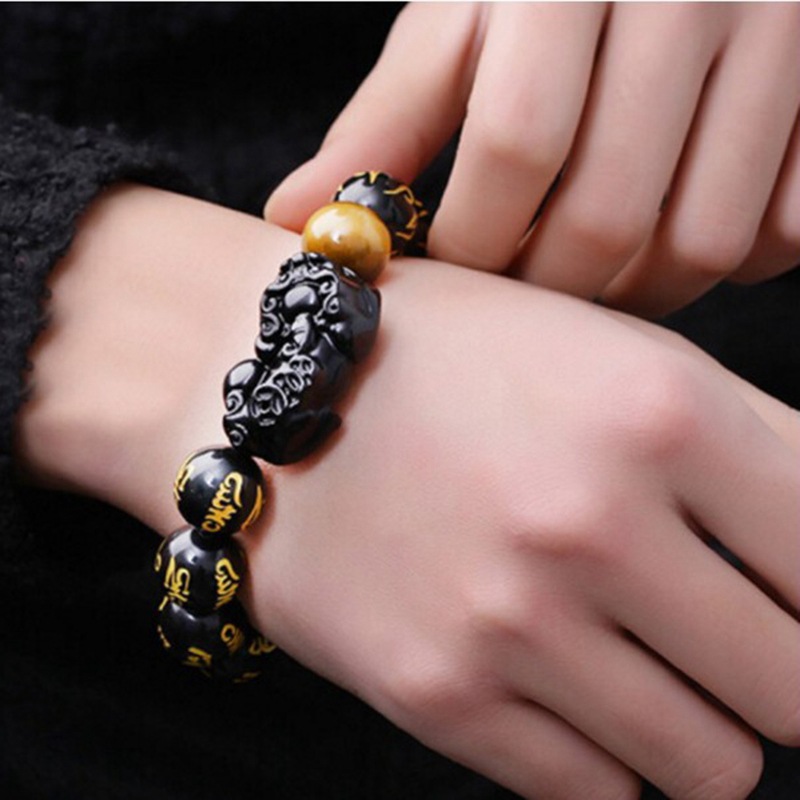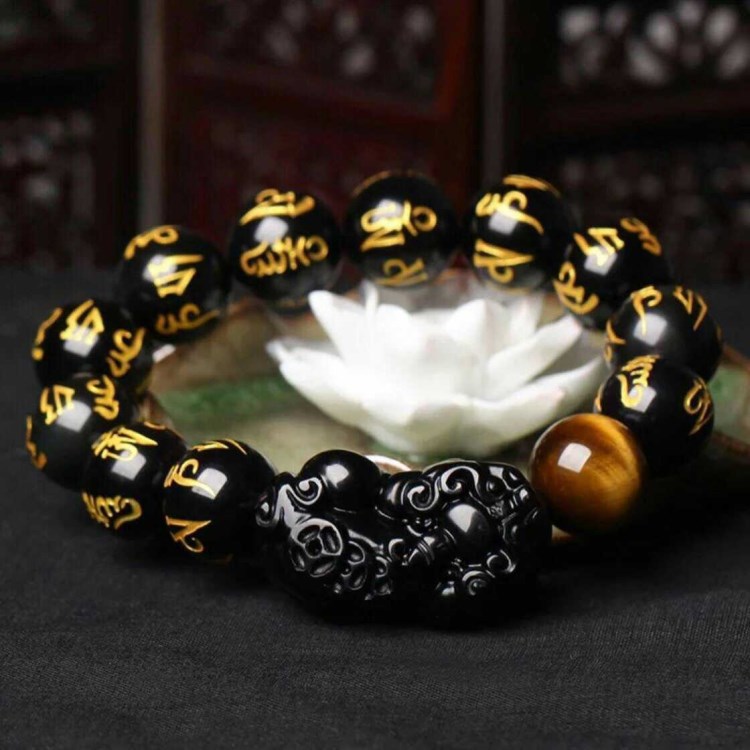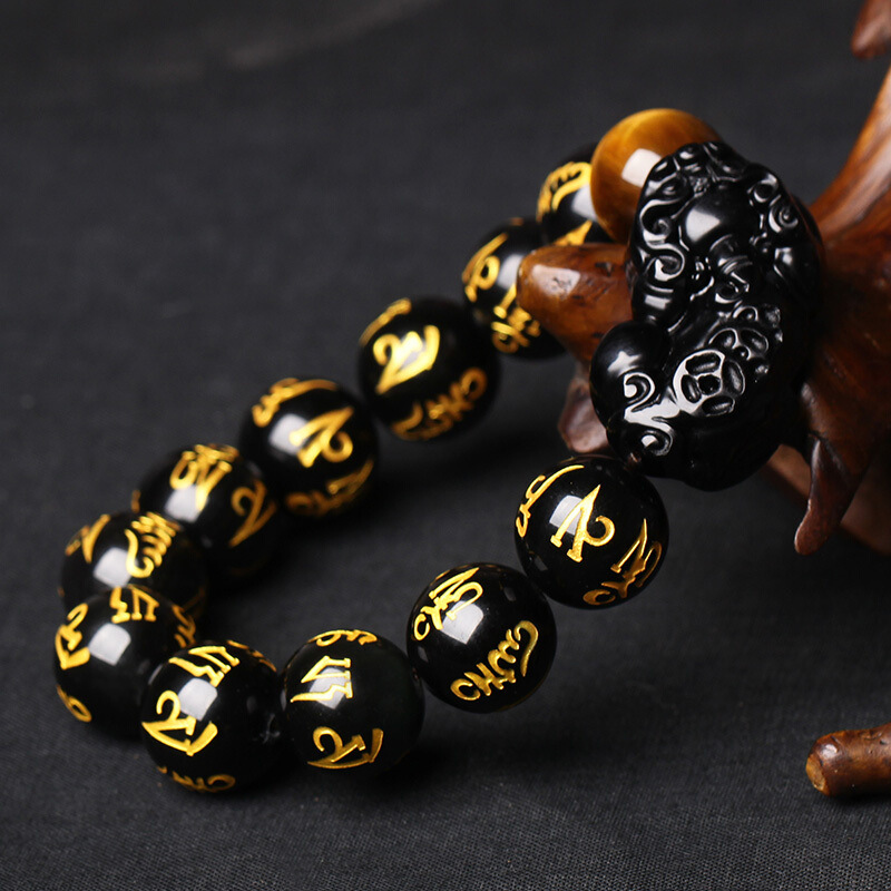 【天然黑曜石三錢貔貅】【燙金六字真言】【事業虎眼石】天然黑曜石貔貅虎眼石手串男女招財辟邪旺事業手鍊