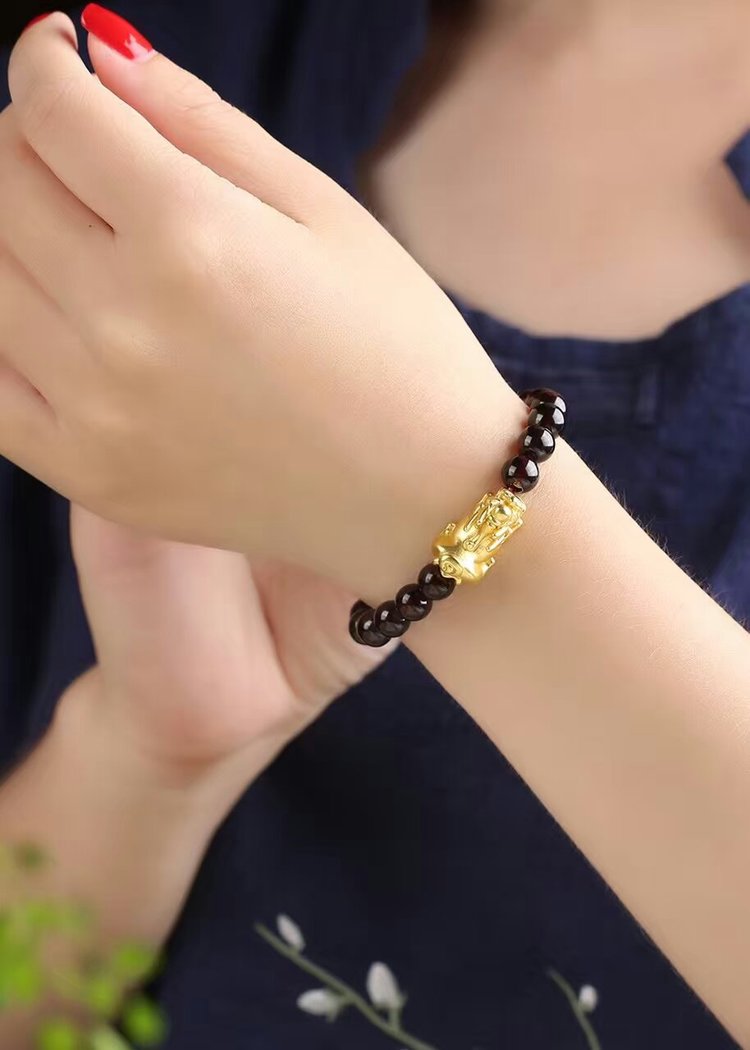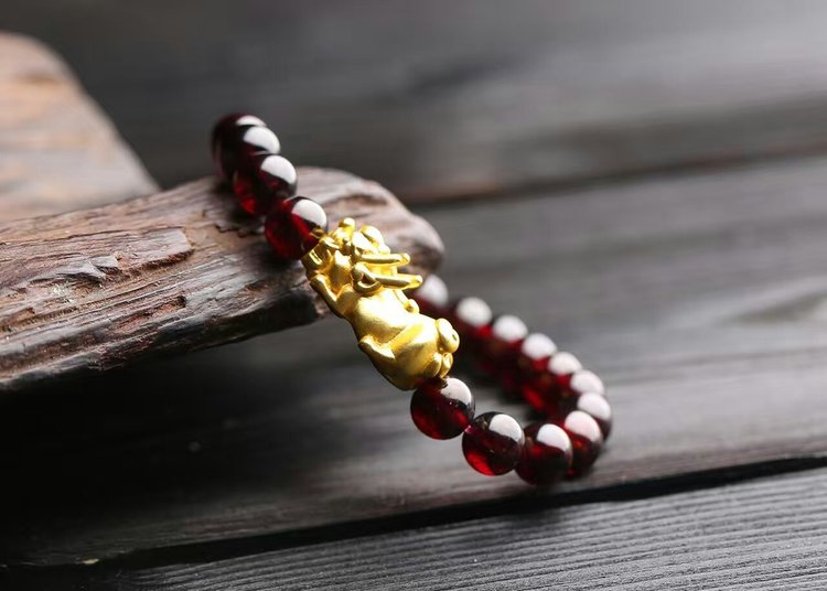 【天然酒紅石榴石】【3D沙金貔貅】天然酒紅石榴石單圈手鍊搭配3D沙金貔貅氣質女招財水晶手鍊