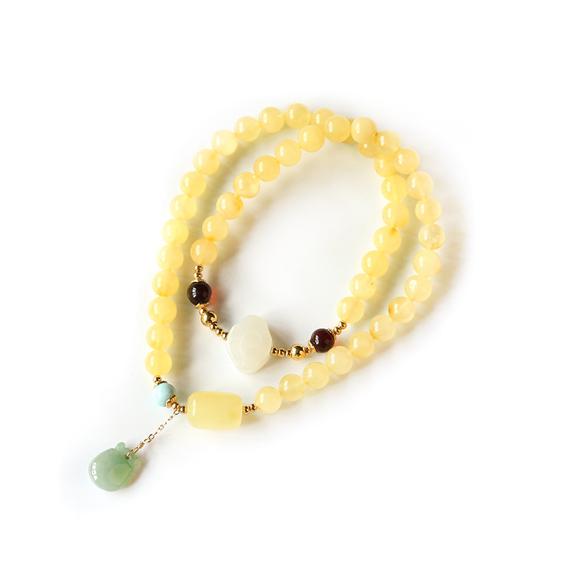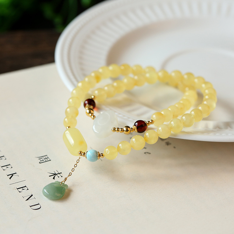 【7A收藏級天然蜜蠟琥珀】【和田玉翡翠如意配飾】【雙層】設計師款名貴雙層蜜蠟手串搭配和田玉翡翠吊墜女佛珠手串手鍊