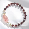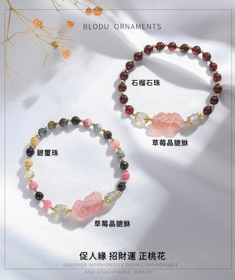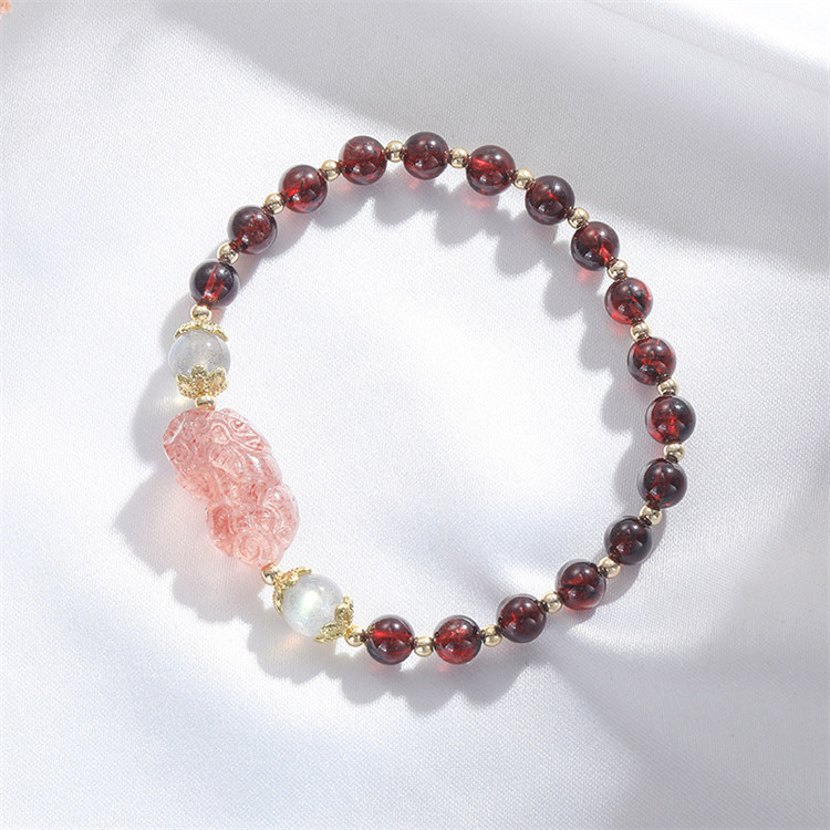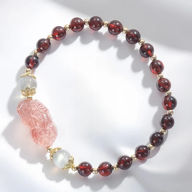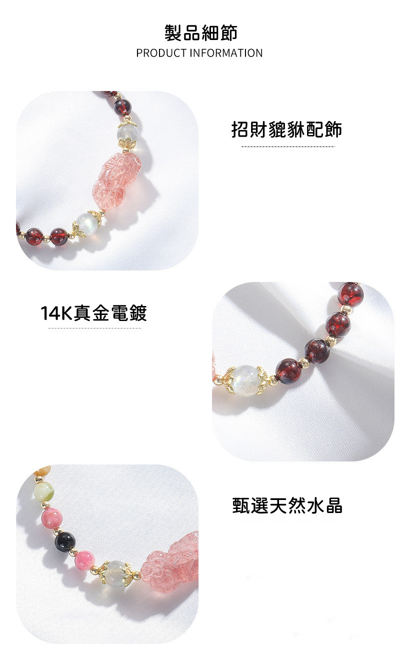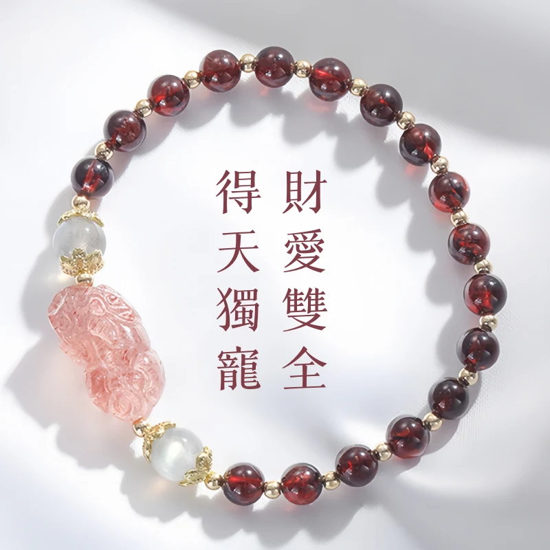 財愛雙全 | 寵愛連連 | 天然石榴石配草莓晶貔貅手鍊 | 14K包金 | 促人緣招財運正桃花天然石榴石草莓晶女招財水晶手鍊