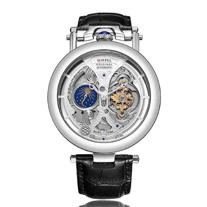 機械工藝美學全自動機械錶 | 瑞士陀飛輪工藝 | 極致雙面鏤空 | 日月星象 | 雙時區時間 | 50米防水 | 小牛皮錶帶 | DIFFUL男士全自動機械手錶
